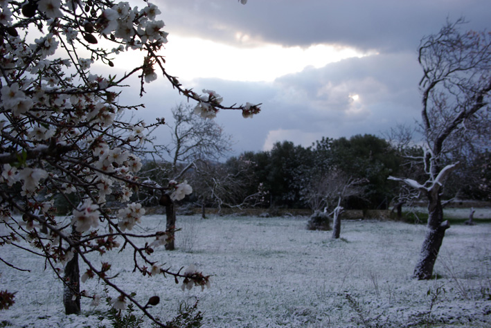 Mandelblüte, auch wenn die Landschaft zugeschneit ist, ja ihr